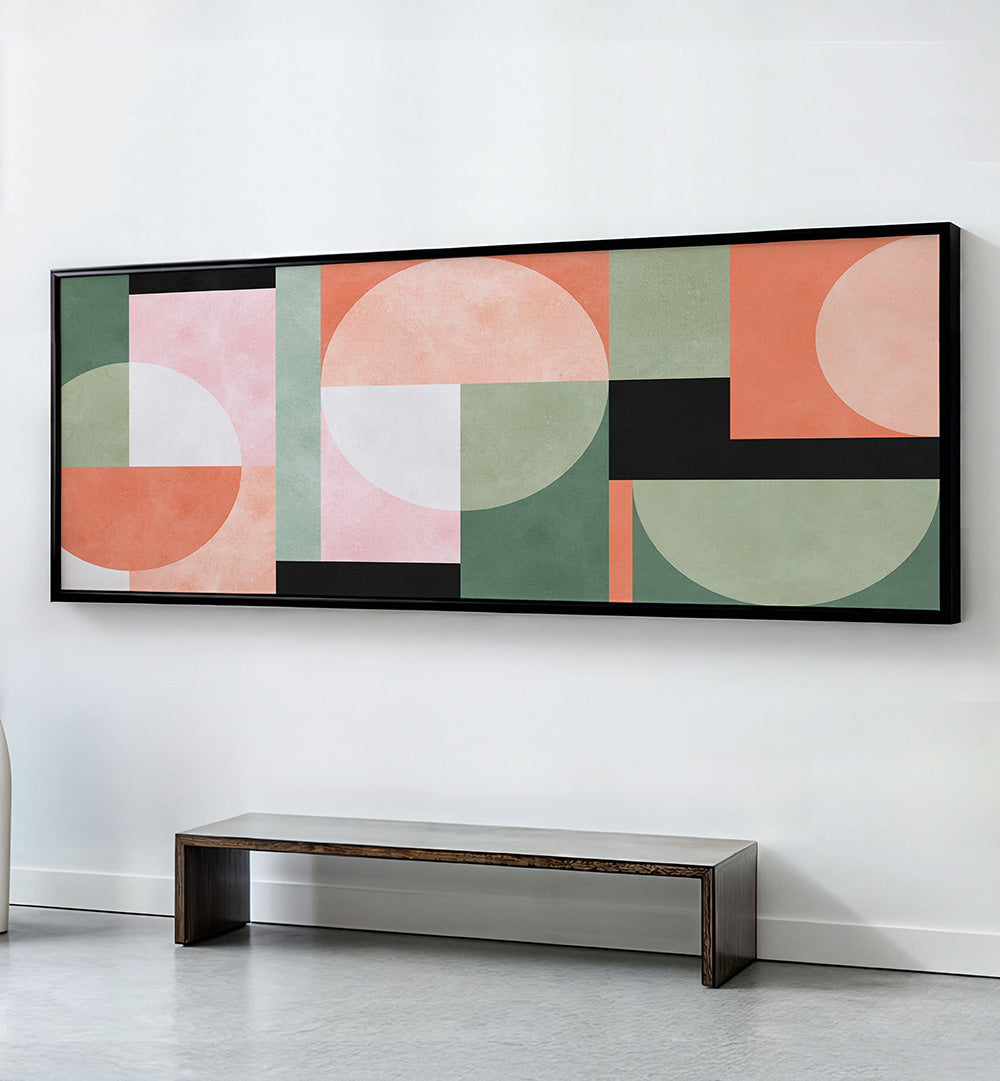 Geometric Modern Art, Panoramic Art offers a bold, contemporary statement for any wall. Blending precise geometric forms with a sweeping panoramic layout, this abstract wall decor invites depth, movement, and color into your living room, bedroom, or office.