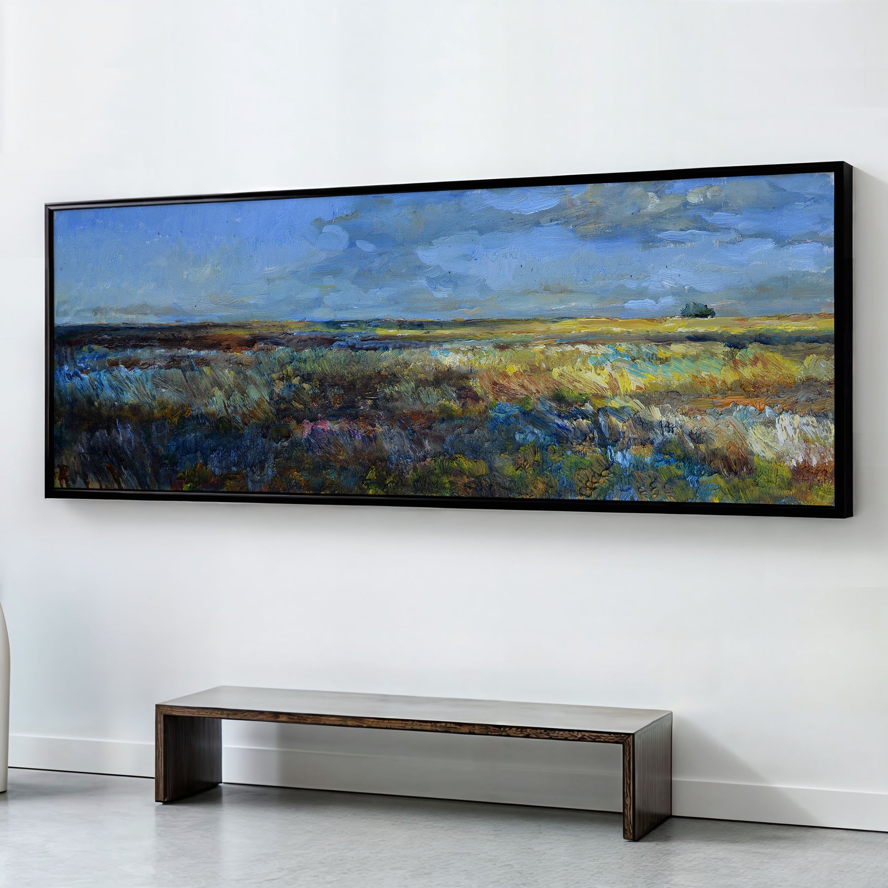 Experience the quiet grandeur of dawn with Sunrise in the Steppe — a panoramic art print that captures the vast, open horizon as the first light spills across the grasslands. This piece brings a sense of space and calm to any room, turning walls into a window to the early morning countryside.