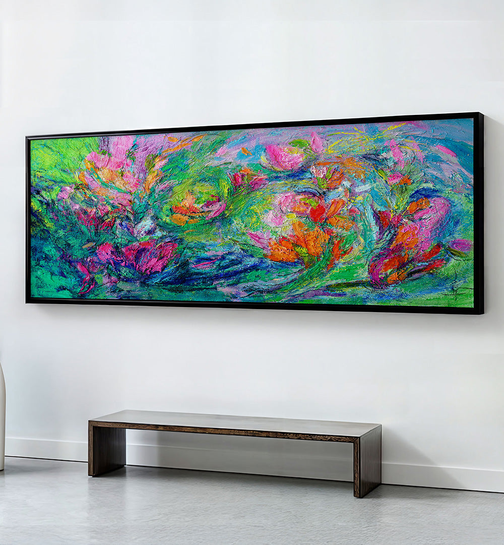 Capture the beauty of nature with this VIBRANT FLORAL LANDSCAPE, PANORAMIC ART. This expansive piece brings a sweeping floral panorama to life, turning any wall into a vibrant window into spring and summer.