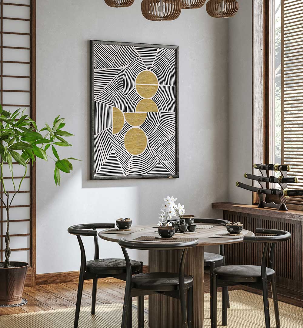 This art print blends geometric clarity with organic rhythm, creating a piece that works as a centerpiece or a cohesive design thread across a room. Ideal for living rooms, bedrooms, hallways, or offices, it elevates spaces with clean lines, striking contrast, and a contemporary sensibility.