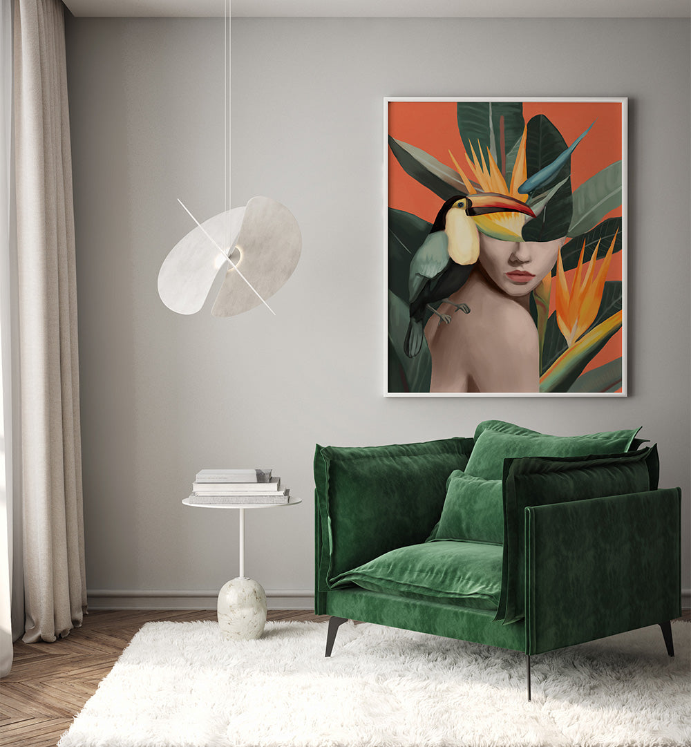 This evocative piece captures a moment of serene introspection amidst lush botanical abundance through layered symbolism and rich, textural composition. Museum-quality printing reveals every intricate detail—from delicate tropical foliage to atmospheric depth—creating a visual meditation that transports viewers to a tranquil, otherworldly paradise.