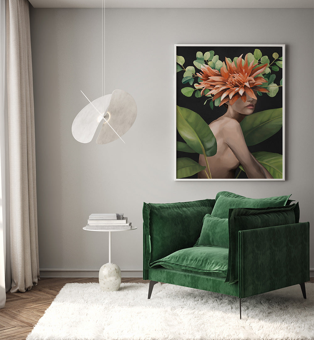 VIELD BY BLOOM evokes a serene, dreamlike atmosphere where tropical beauty meets surreal artistry in this captivating print by NADJAA.