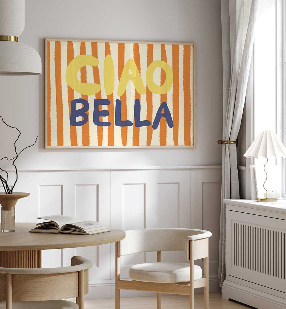 Each poster pairs bold sans-serif lettering with elegant script on clean, neutral backgrounds, offering a versatile look that works in living rooms, bedrooms, home offices, or cafés. The "Ciao Bella" motif adds a playful, Italian-inspired charm that remains timeless across décor trends.