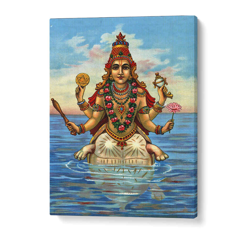 Witness the divine power of KURMA AVATAR by Raja Ravi Varma, depicting Lord Vishnu's tortoise incarnation during the cosmic churning of the ocean. This magnificent artwork brings ancient mythology to life with vibrant colors and dramatic composition.