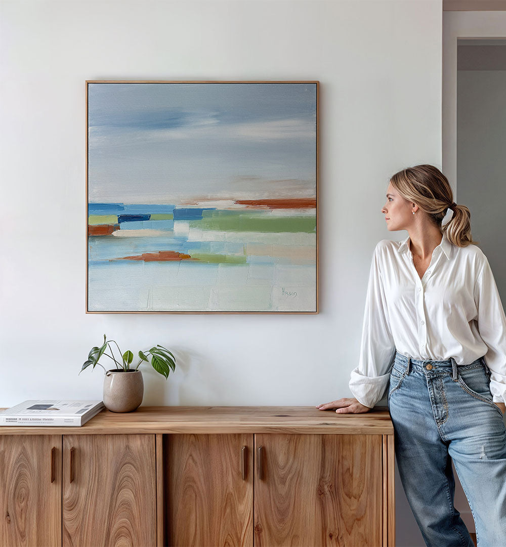 Sandrine Hirson is a minimalist and abstract painter based in the North of France. For more than ten years, she has been creating colorful abstract paintings inspired by nature, light, and emotions. Her style is characterized by refined minimalism, harmonious colors, and an intuitive approach that transforms each work into a space of calm and balance. A recognized colorist artist, she uses oil to compose contemporary paintings valued in interior design and modern art. Her works are sold worldwide through galleries, exhibitions, and private collections. Sandrine Hirson develops a modern, minimalist abstract art sought after by lovers of contemporary art, refined design, and colorful painting inspired by nature.