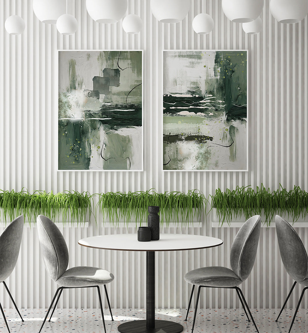 The Green Pause Set brings the calming essence of nature's quiet moments to your walls with two serene paintings that celebrate the restorative power of green, the beauty of stillness, and the peaceful pause found in natural spaces.