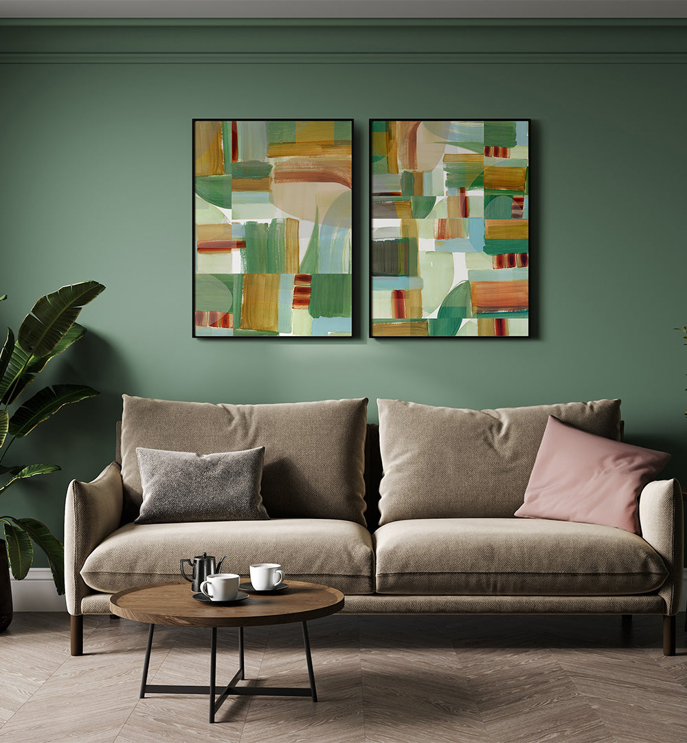 The Greenhouse Abstract Set transforms your walls into a vibrant botanical sanctuary with two stunning paintings that blend lush greenery with contemporary abstract design.