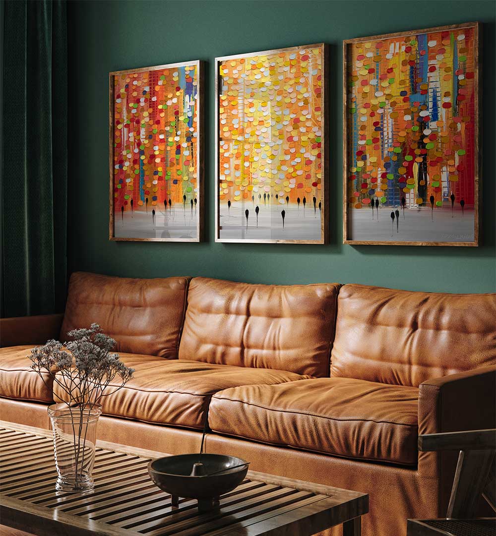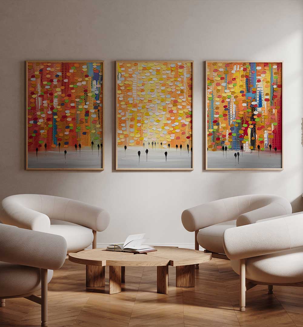 Bring dynamic energy and urban expression to your space with the Chromatic Streets Set – Set of 3 Paintings. This striking trio celebrates the vibrant rhythm of city life through bold color contrasts, geometric layering, and abstract movement that evokes bustling streets, architecture, and metropolitan pulse. Each piece contributes to a compelling visual narrative — together composing a stylistic journey through color, shape, and rhythm that enhances modern interiors with personality and intensity.