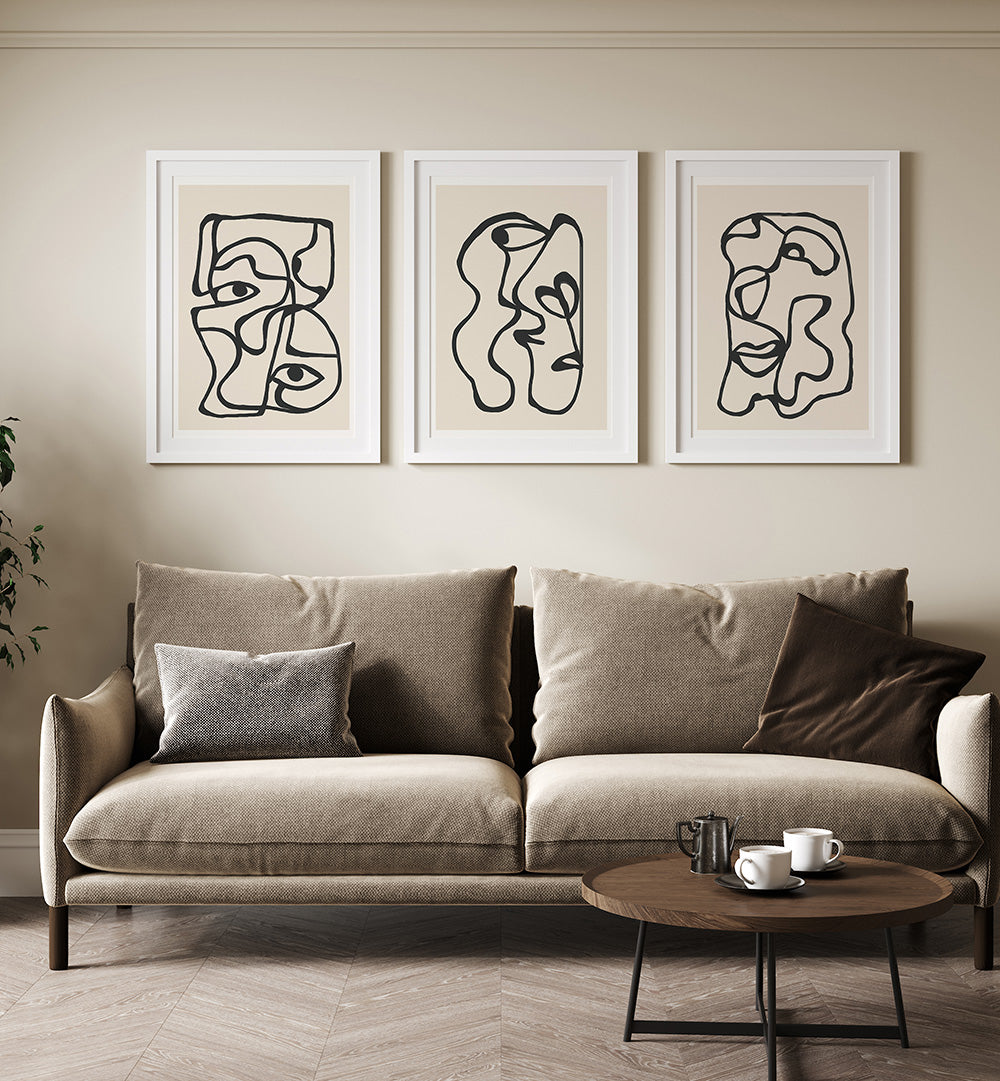 Arrange all three pieces in a horizontal row for classic gallery styling, create a vertical stack for dramatic impact, or position them in an asymmetrical cluster for contemporary flair. Pair with sleek black frames for modern drama, natural wood frames for organic warmth, or minimalist white frames for gallery-inspired elegance. Perfect alongside other abstract art, line drawings, or as a standalone statement collection.