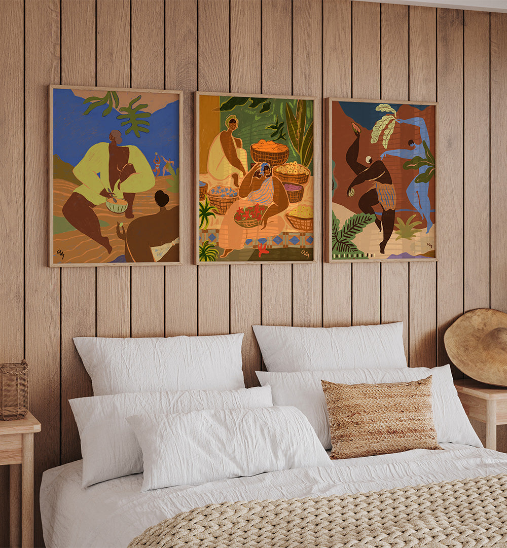 - Set of 3 Coordinated Paintings - Expertly curated artworks that create a harmonious and culturally rich gallery wall