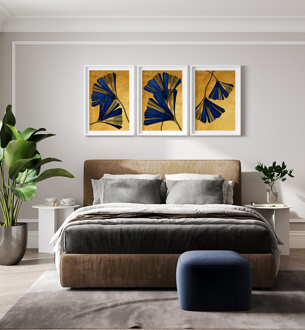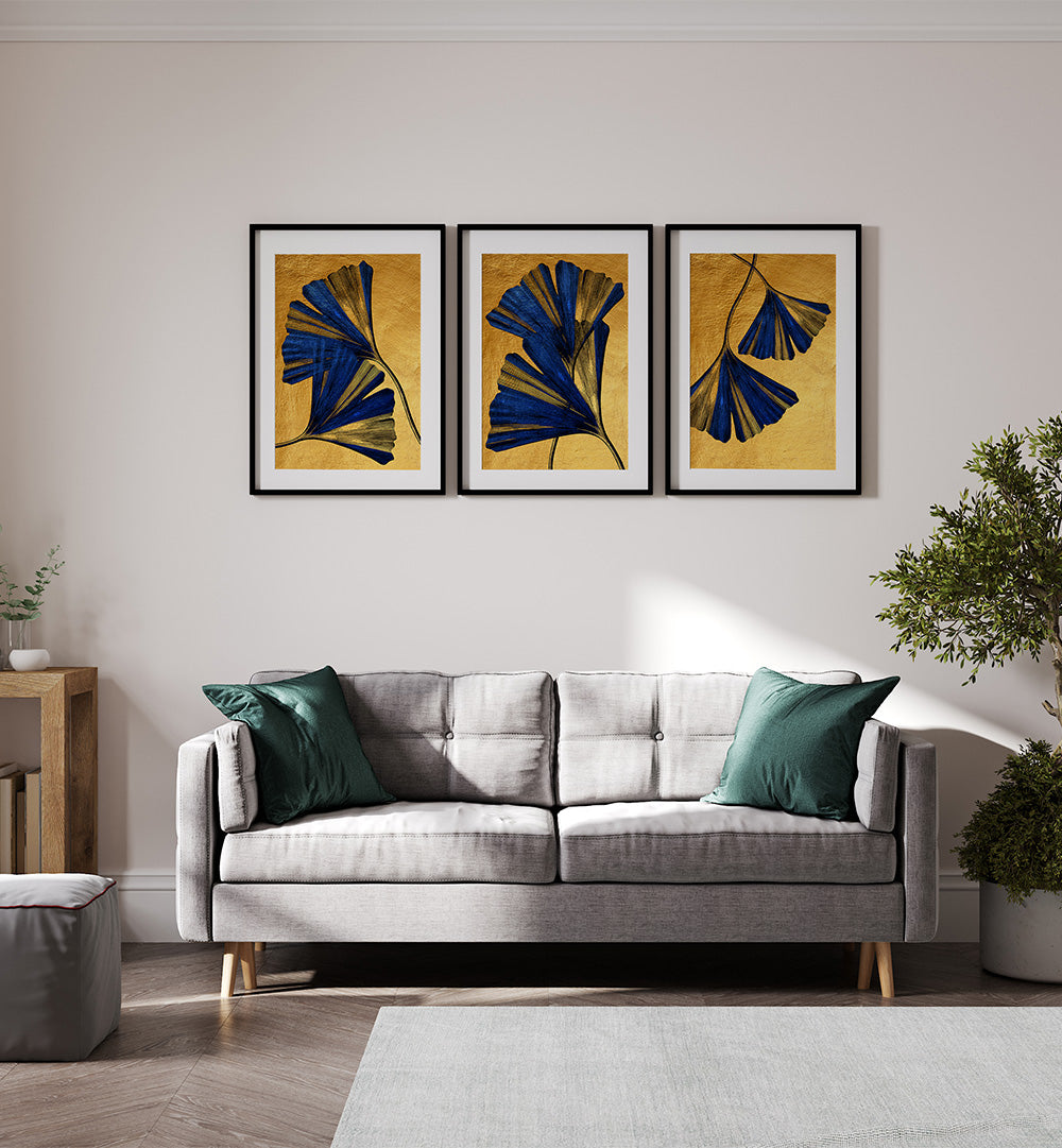 Together, the three artworks create a harmonious gallery wall that fuses botanical charm with modern sophistication. Whether you hang them as a unified statement above a sofa or bed, or spread them across different rooms to carry a cohesive leafy theme, the Royal Leaf Symphony Set infuses your interiors with natural rhythm and elegant calm.