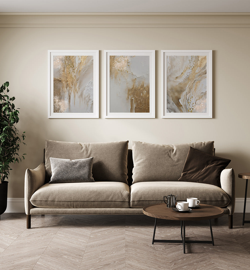The set features a delicate interplay of shimmering gold accents layered over soft, neutral textures. With fluid abstract forms and "whispered" metallic details that catch the light, these three pieces create a cohesive visual rhythm that transforms any room into a serene sanctuary. Whether arranged in a classic horizontal line or a creative staggered layout, the Whispered Gold Set adds a touch of sophisticated glamour without overpowering your decor.