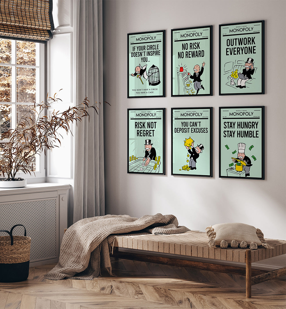 Hustle Monopoly — Set of 6 Paintings is a bold gallery wall set designed to energize modern interiors with a dynamic blend of ambition, strategic visual motifs, and coordinated artistic flair. Inspired by the competitive spirit of hustling and the iconic cultural imagery associated with strategy and success, this curated ensemble brings a powerful visual narrative to your wall.