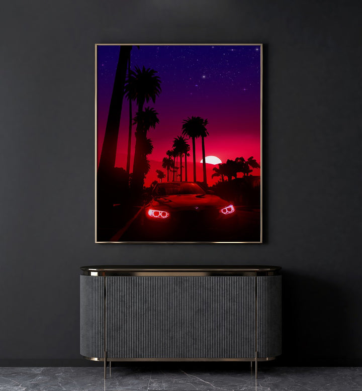 NEON SUNSET DRIVE, SURREAL ART PRINTS by Ritvik Takkar captures a vibrant sunset with a sleek car and palm trees.