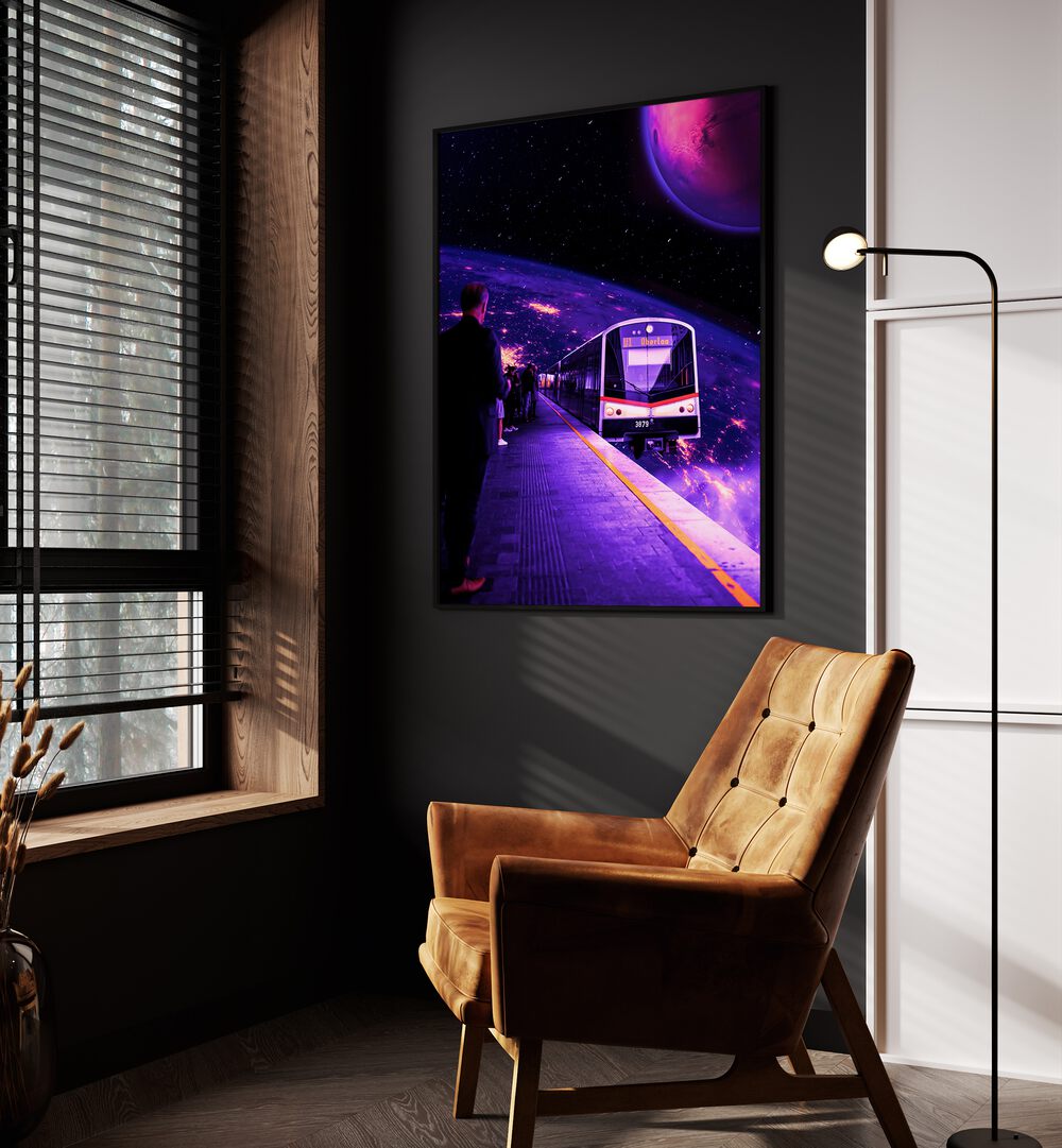 Surreal art prints featuring the "Space Train" by Ritvik Takkar, blending cosmic elements with urban scenery.