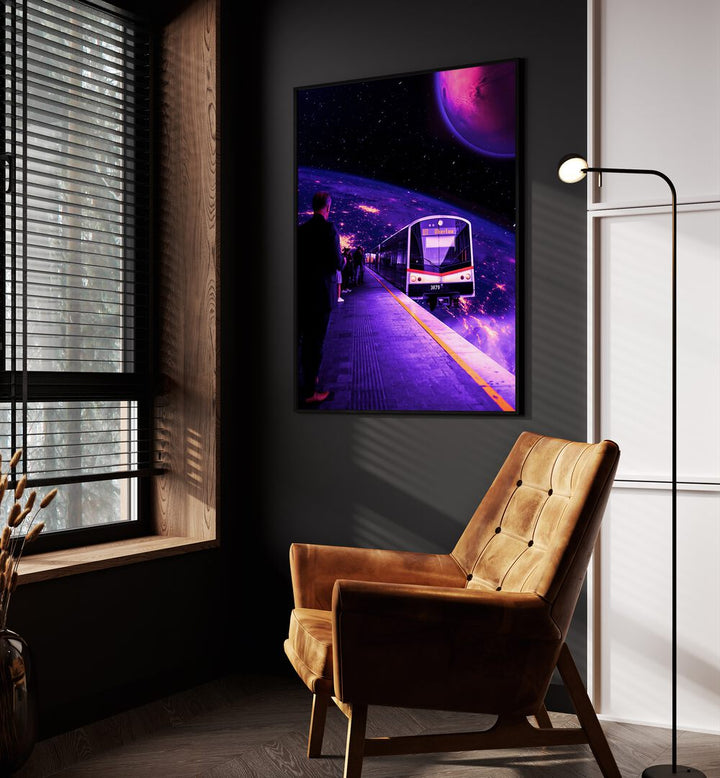 Surreal art print "SPACE TRAIN" by Ritvik Takkar transports viewers to a cosmic train station. Ideal for any art lover.