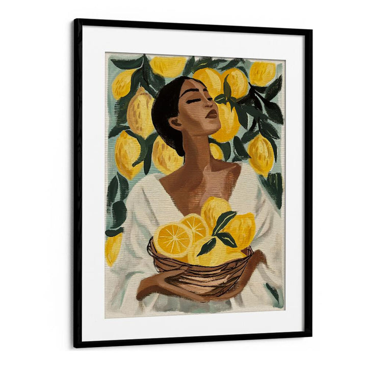 Vibrant Composition – A graceful woman, basking in the glow of nature, holds a basket of ripe lemons against a backdrop of lush citrus trees, symbolizing prosperity, joy, and renewal.