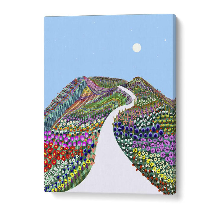 Vibrant FIRST BLOSSOM, LANDSCAPE PAINTINGS by Uma Gokhale, showcasing a colorful floral pathway and serene hills.