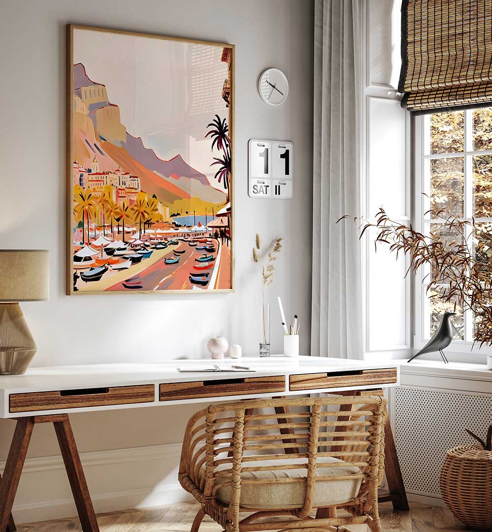 Whether you’re decorating a sunlit living room, a chic bedroom, or an inspiring office, these prints bring a sense of wanderlust and romance to any space. Each piece evokes seaside promenades, pastel harbor houses, and the glitter of marina lights at twilight.