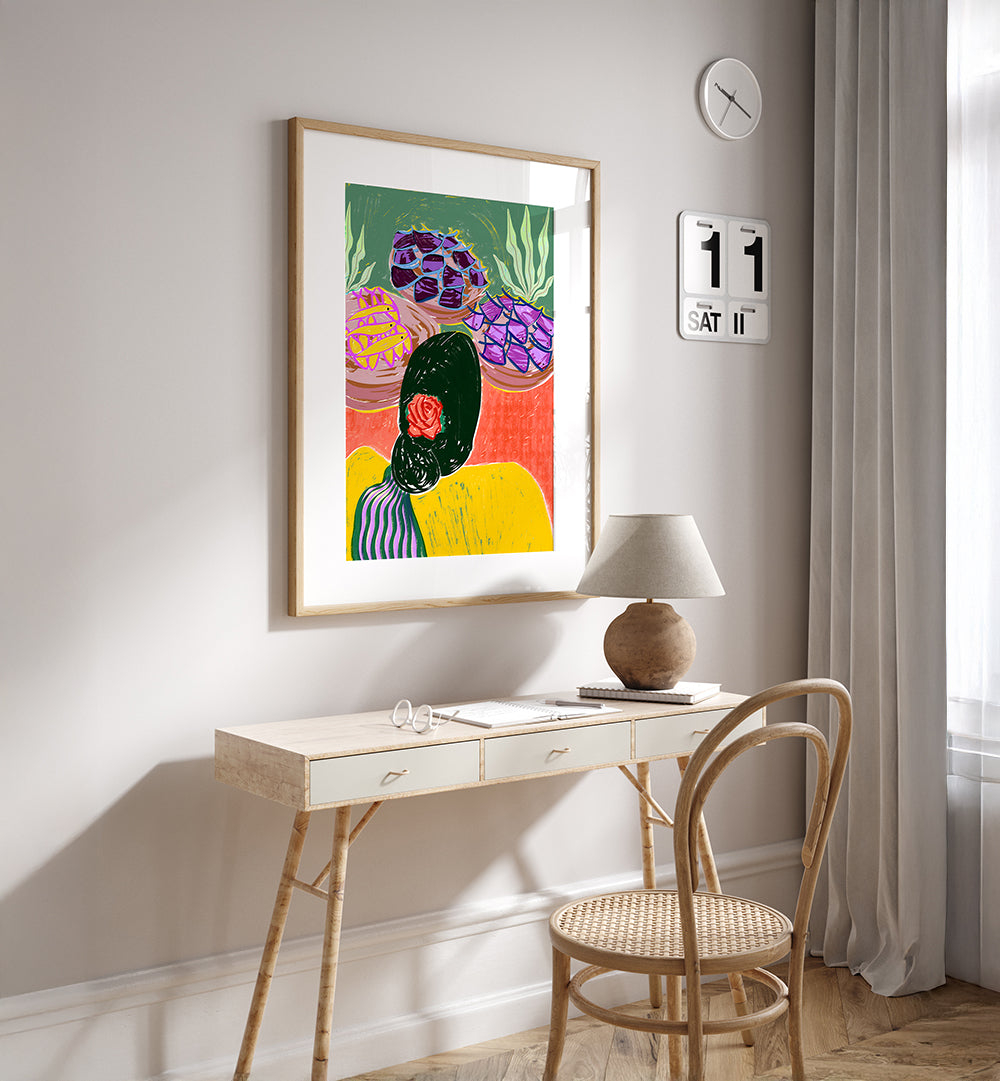 Bring this beautiful woman with a floral hairstyle into your home and enjoy a piece that tells a story of heritage, beauty, and craft through art, color, and form.
