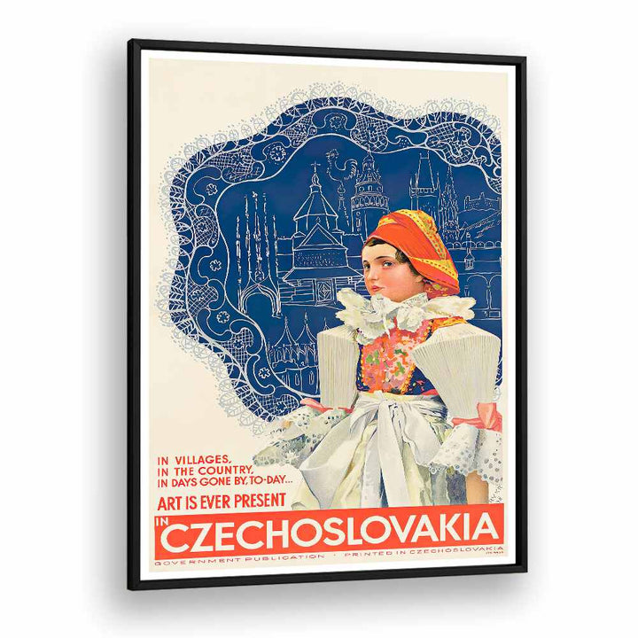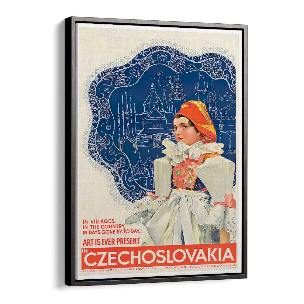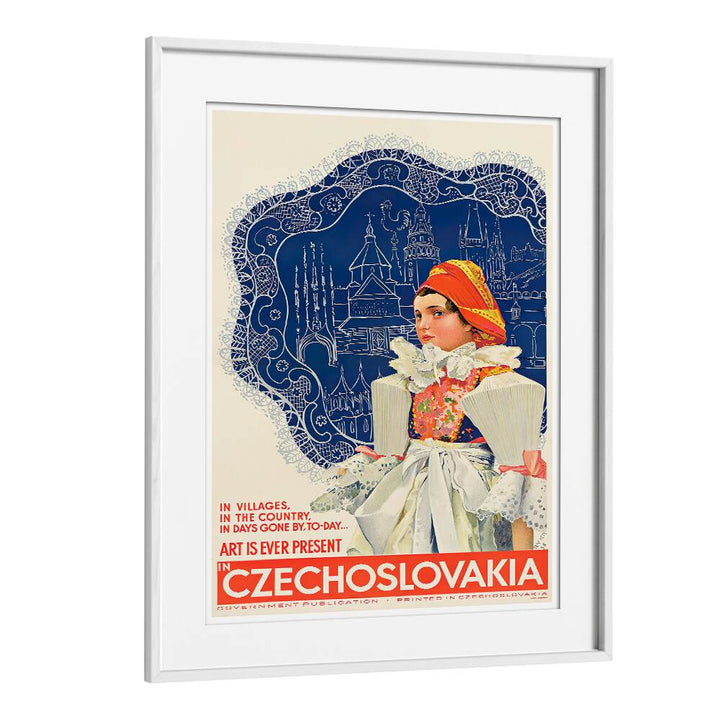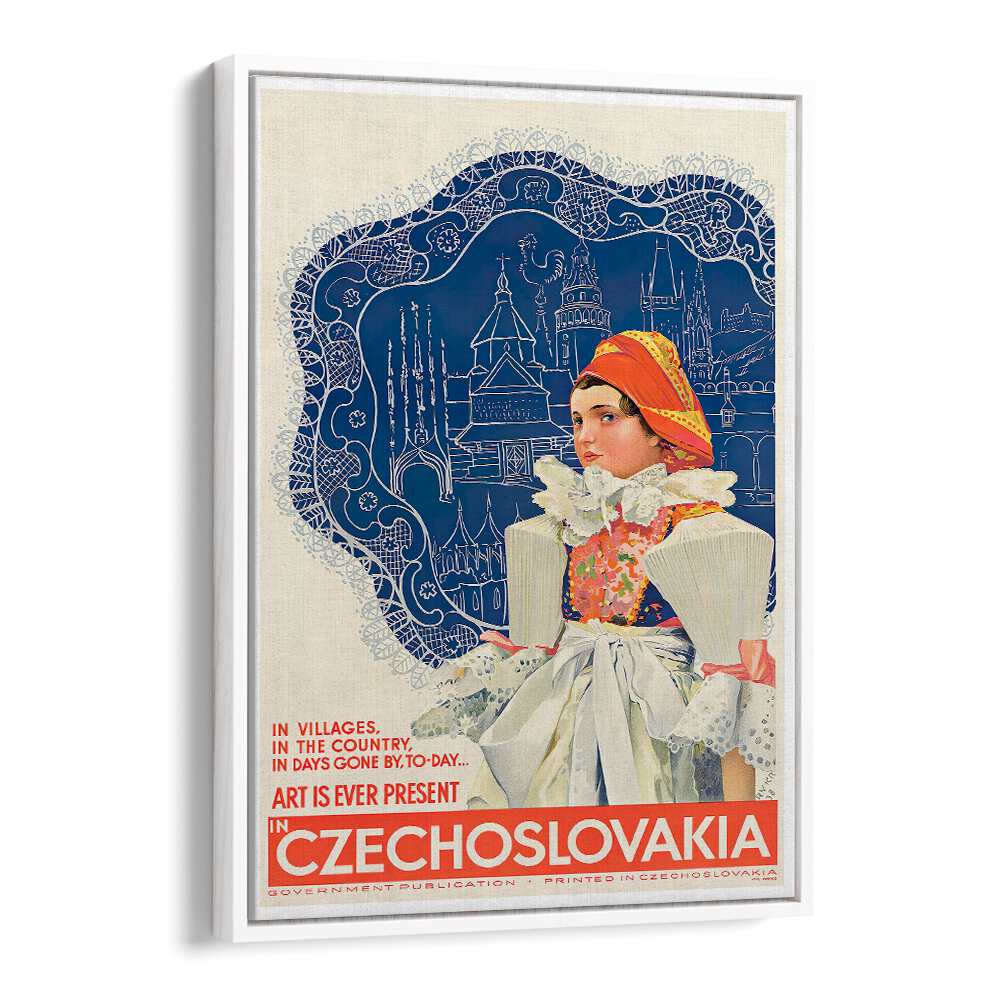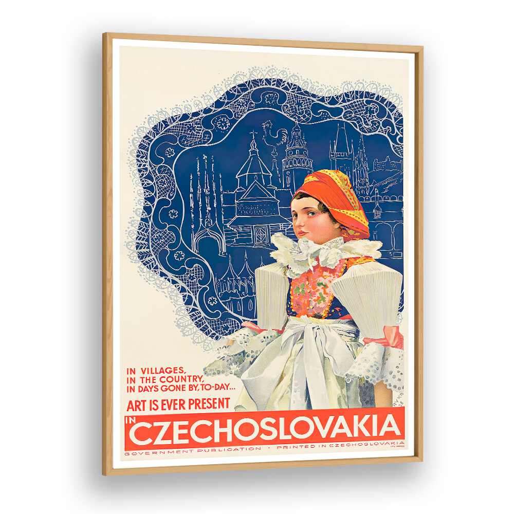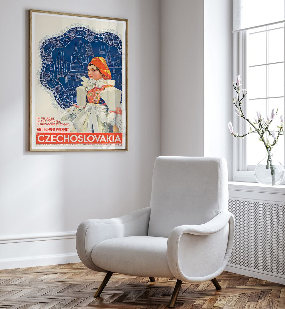 Explore CZECHOSLOVAKIA, VINTAGE TRAVEL POSTERS featuring traditional attire and iconic landmarks for art lovers.