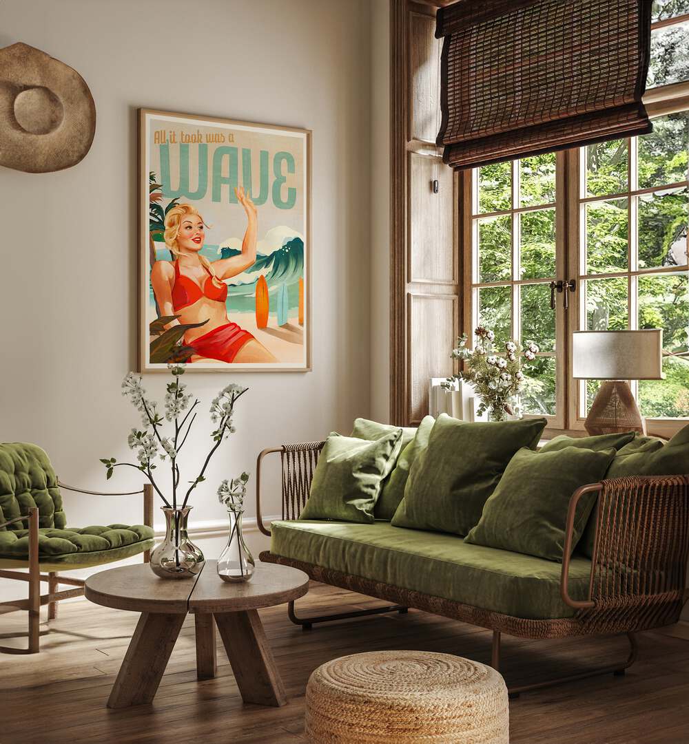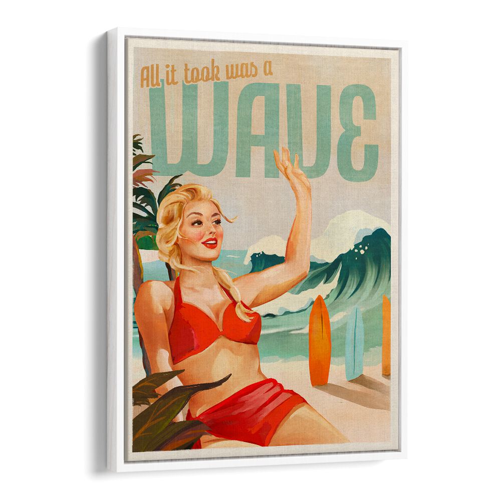 This enchanting painting doesn’t just serve as a decorative piece; it also tells a story of adventure and leisure. The spirited pose of the pinup girl on her surfboard evokes memories of sun-soaked days and carefree beach escapades.