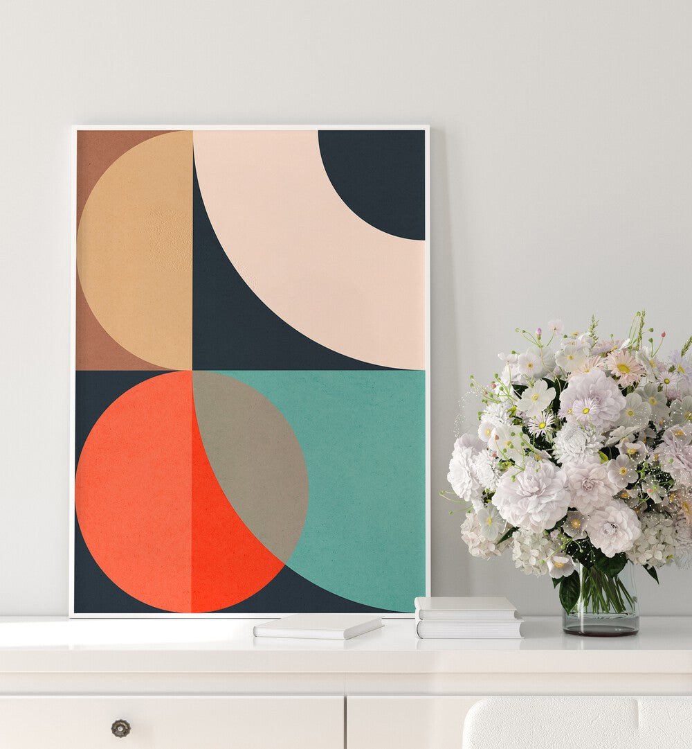 Vibrant abstract design featuring circles in hues of red, teal, and beige, perfect for CIRCLES IN HARMONY IV, GEOMETRIC ART PRINTS.