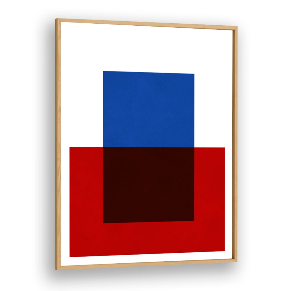 Colorful overlay geometric art prints featuring vibrant blue, red, and brown shapes on a white canvas background.