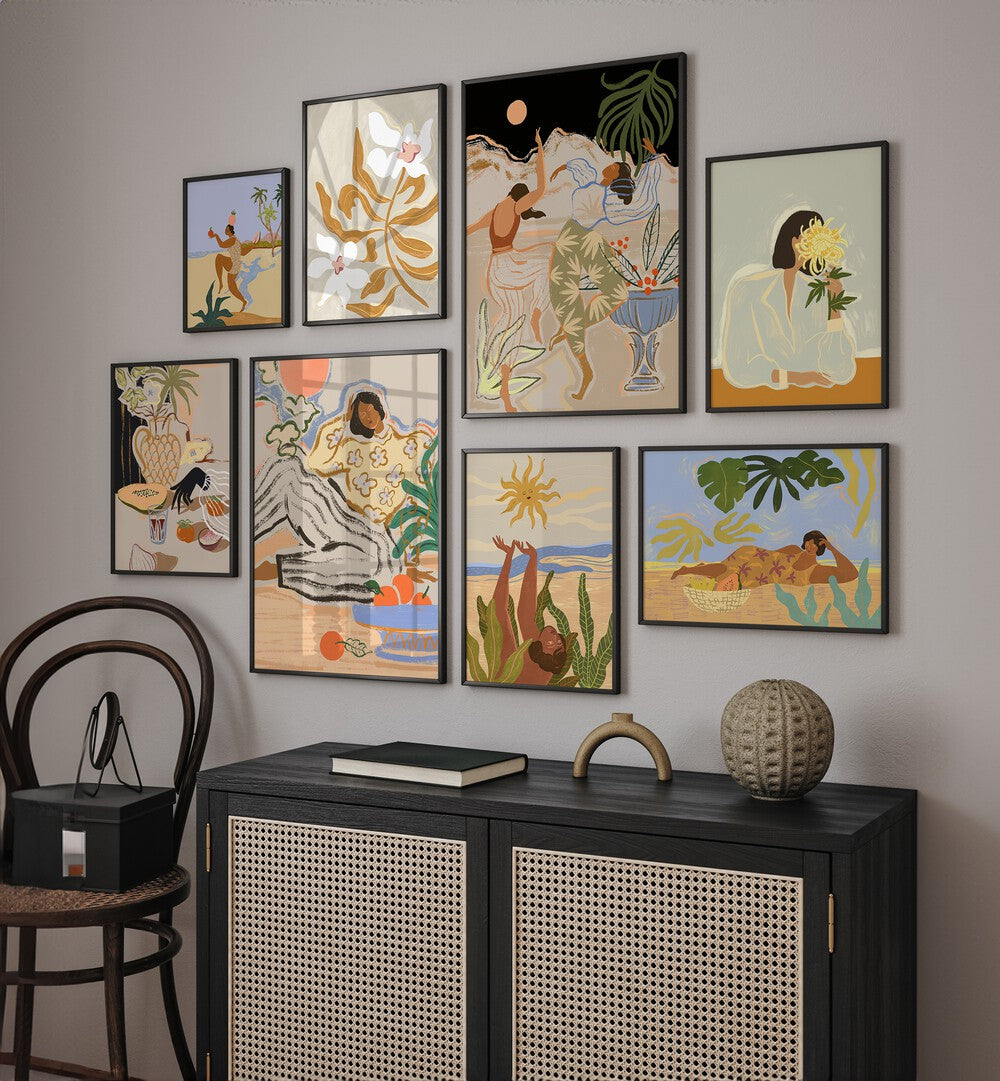 The Arty Guava Artworks Gallery Wall is a lively and diverse collection of framed art prints that radiates creativity, warmth, and charm. Each piece features dynamic designs with vibrant colours, whimsical illustrations, and organic themes inspired by nature and everyday moments, creating a harmonious visual narrative that enlivens any room. Ideal for living rooms, studios, or creative spaces, this gallery wall complements modern, bohemian, or eclectic decor, making it a striking focal point that sparks conversation. The rich tones and playful imagery add depth and personality, enhancing the character of your home. Printed on premium museum-grade canvas and fine art media, these framed artworks are crafted for durability and lasting beauty. Perfect for those who value art that resonates with emotion and individuality, the Arty Guava Artworks Gallery Wall offers a transformative way to infuse your space with artistic expression and inspiration.