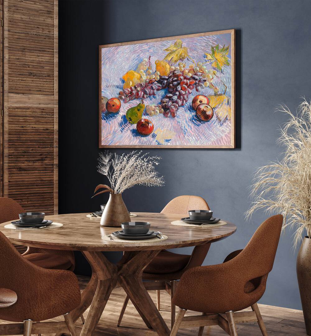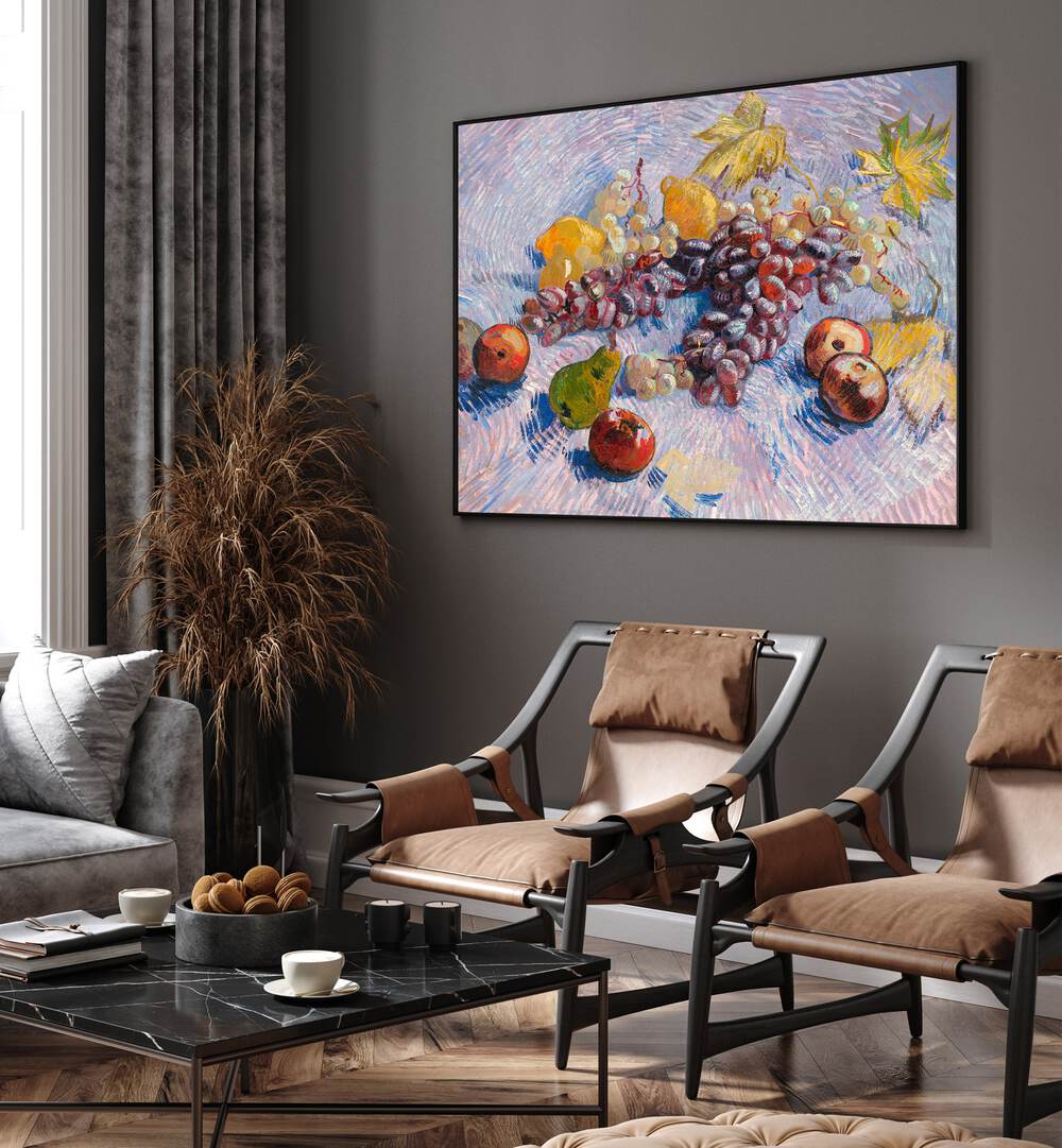 Your home deserves a touch of history and elegance. Illuminate your walls with this stunning depiction of grapes, lemons, pears, and apples, and let the vintage charm transform your living space into a gallery of timeless art.