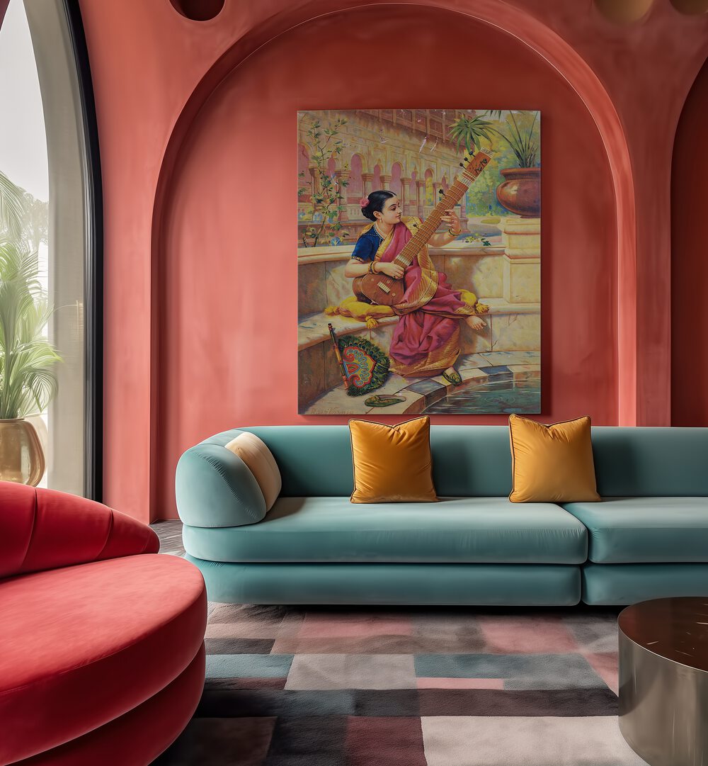 Introduce a piece of history and artistry into your home with the mesmerizing KADAMBARI PLAYING SITAR painting by the renowned artist Raja Ravi Varma. Now available as premium museum-grade canvas and fine art media prints, this artwork is perfect for art enthusiasts and those looking to elevate their space.