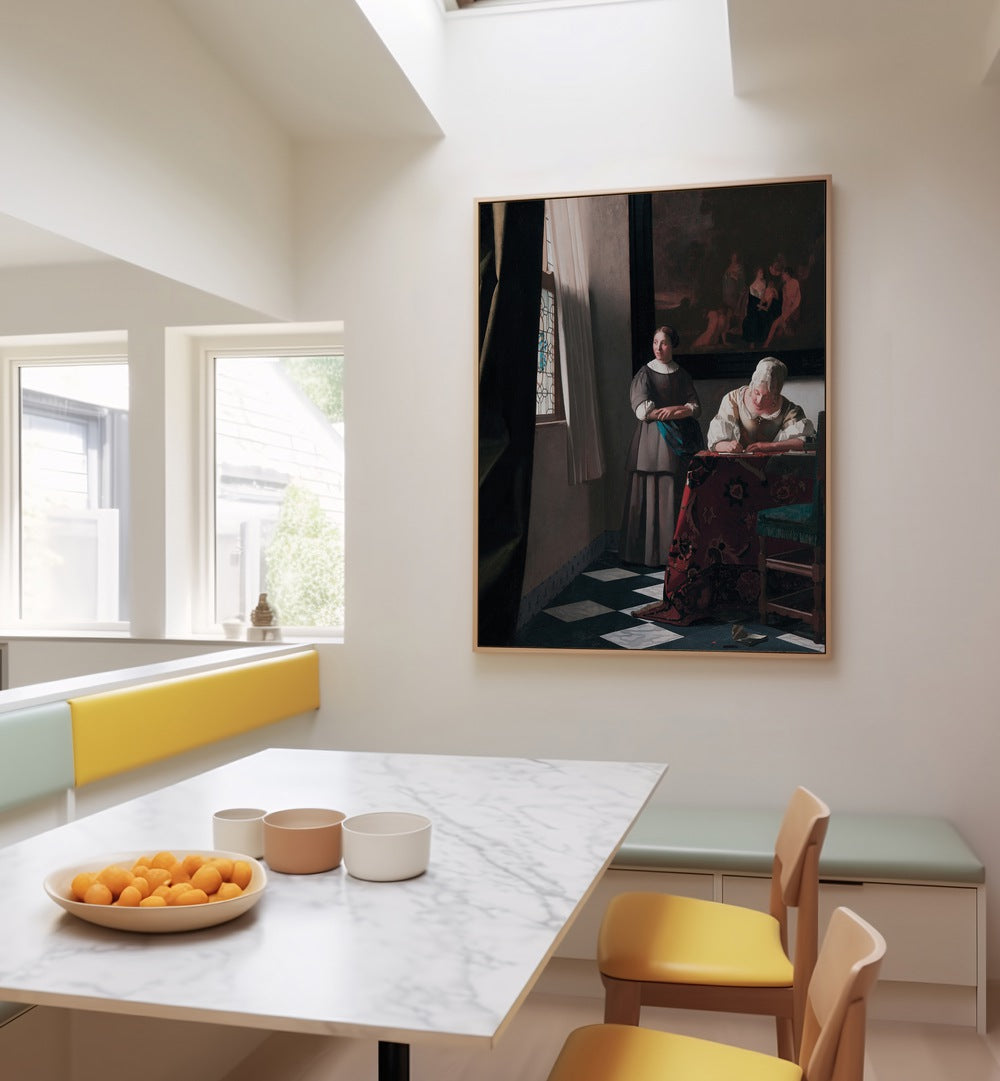 Step into a world of refined beauty with “Lady Writing a Letter with Her Maid” (ca. 1670–1671) by Johannes Vermeer. This exquisite vintage painting captures a moment of intimate conversation and intellectual engagement, showcasing Vermeer’s masterful ability to depict light and texture.