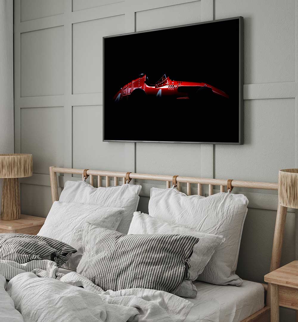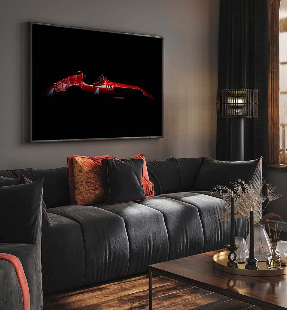 - Iconic Maserati F250 II artwork: A dynamic depiction that highlights the car’s distinctive grille, aerodynamics, and silhouette.