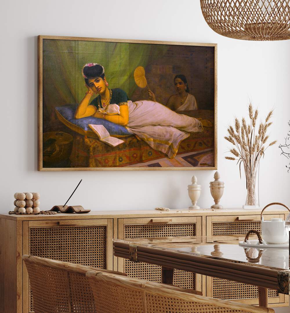 Made with high-quality materials, this artwork promises to be a lasting addition to your collection, bringing joy and inspiration for years to come. Experience the blend of artistic brilliance and modern elegance with RECLINING WOMAN by Raja Ravi Varma.