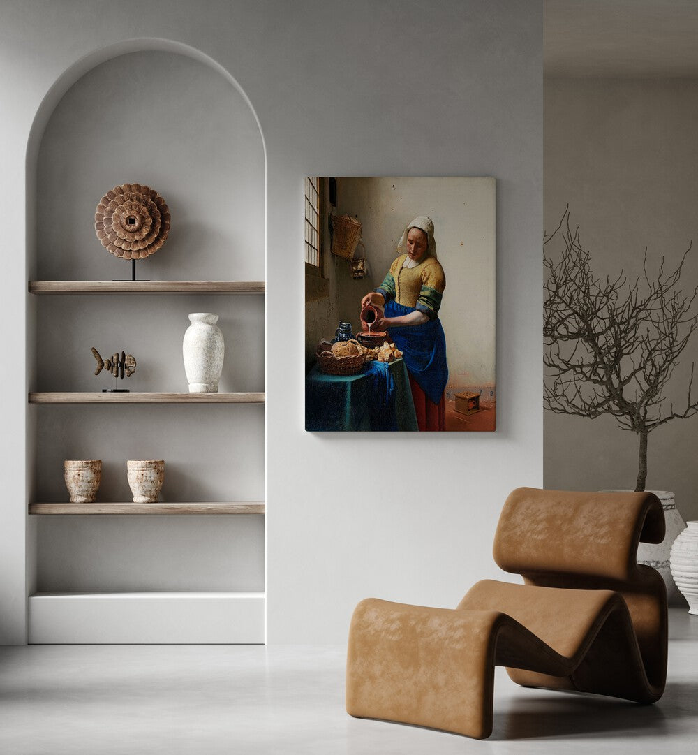 Step into the world of classic art with The Milkmaid, a mesmerizing painting by the renowned Dutch master Johannes Vermeer, created circa 1660. This vintage masterpiece encapsulates the beauty and tranquility of everyday life in the 17th century.