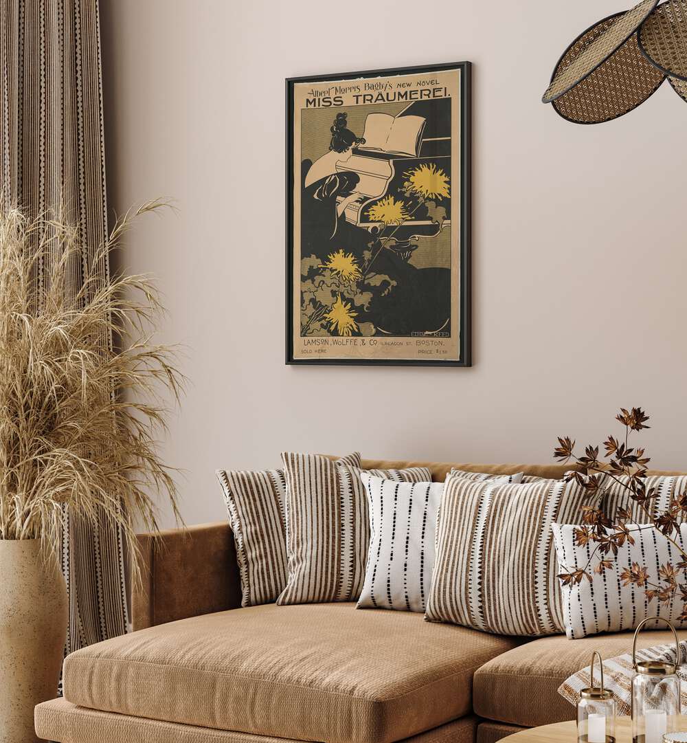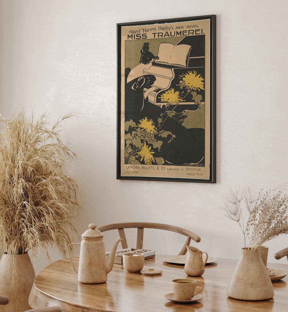 Woman Playing Piano With Art Nouveau Style Chrysanthemum By Ethel Reed Vintage Paintings in Black Frame With Mount