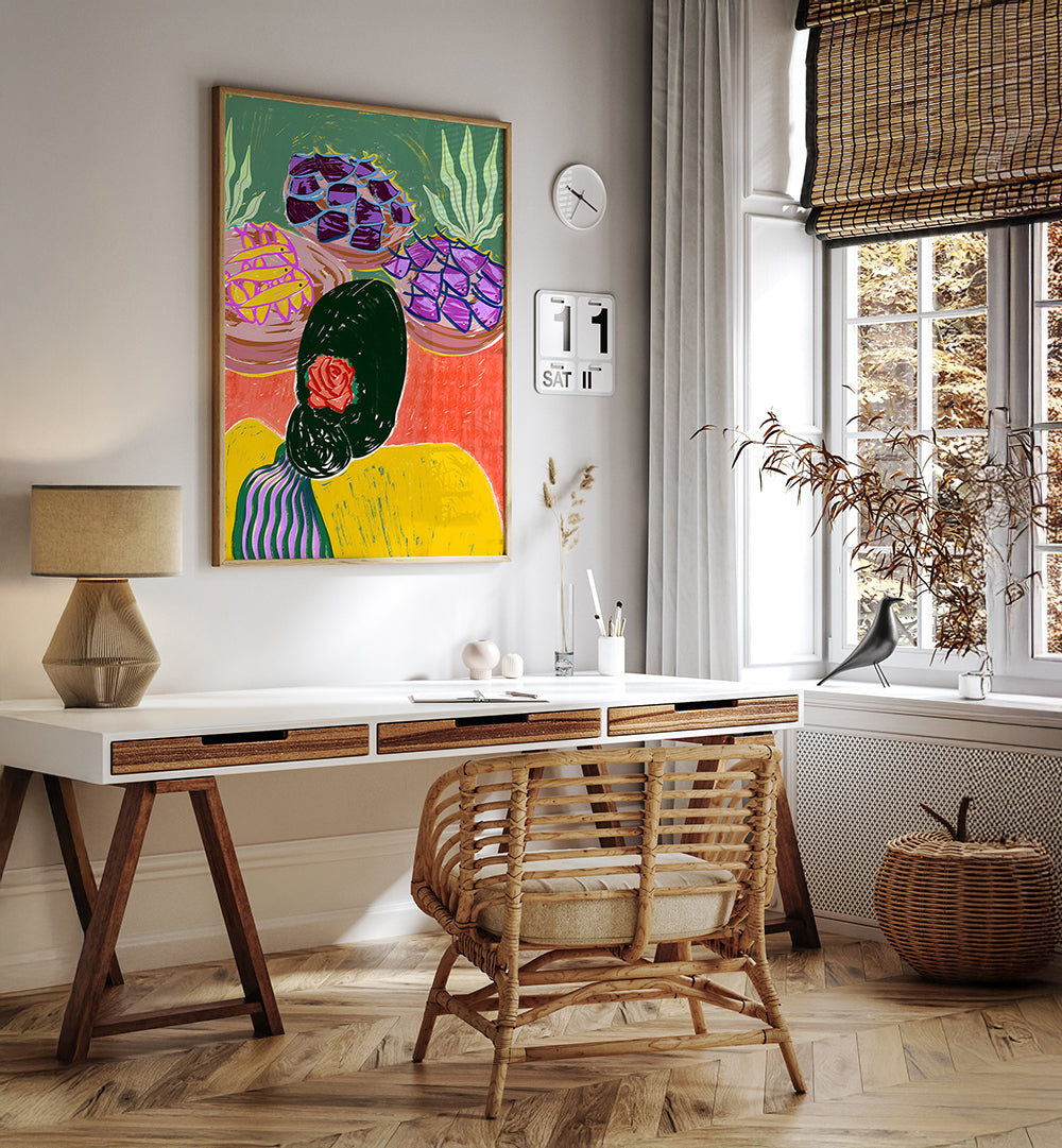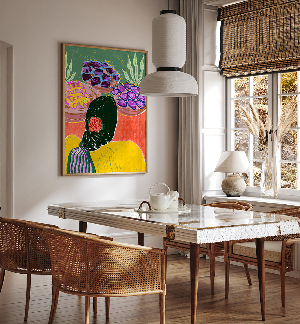 Bring this beautiful woman with a floral hairstyle into your home and enjoy a piece that tells a story of heritage, beauty, and craft through art, color, and form.